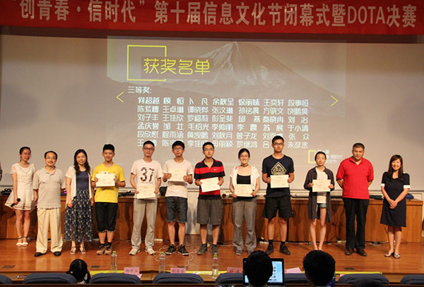 最后进入最吸引观众的环节--dota决赛,挺进决赛的两支队伍分别是GMY战队和take my blood战队,在杨泽辉和陈飞勇两位师兄幽默精彩的讲解和点评下,现场观众跟随大屏幕上的游戏赛况发出一阵阵掌声和喝彩声,全场氛围到达整晚的高潮。最终,take my blood队伍技高一筹,赢得了最后的胜利,获得了本届文化节dota决赛的冠军,同时也宣告了本届信息文化节的圆满落幕。