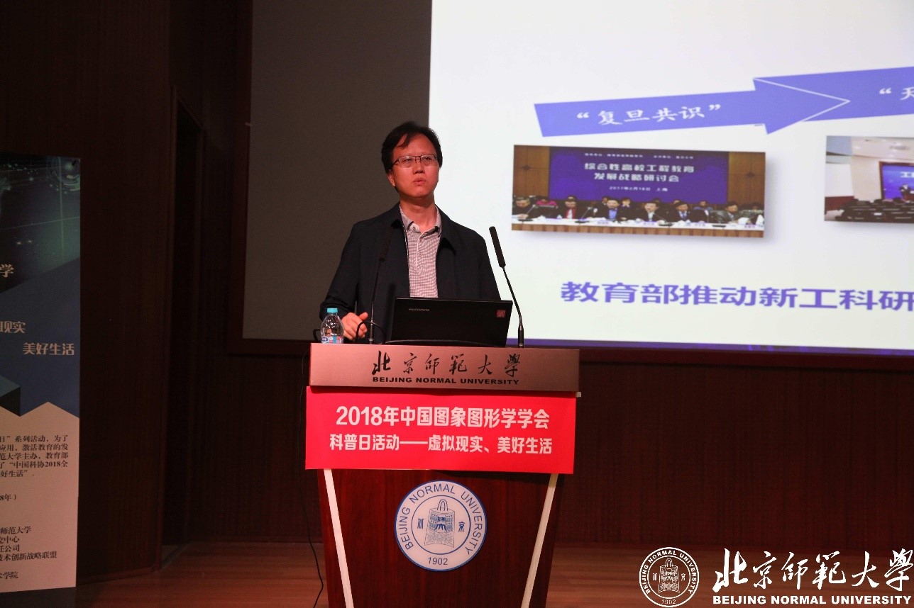 本次活动由中国图象图形学学会主办,北师大信息科学与技术学院虚拟现实应用教育部工程研究中心承办,100余位来自各个单位和领域的科技工作者和科普爱好者参加了本次活动。中国图象图形学学会科普与教育工作委员会主任、beat365在线唯一官网信息科学与技术学院周明全教授主持活动,学校科研院科学技术处副处长彭定志、信息科学与技术学院党委书记别荣芳教授及校团委负责同志以及中科院计算所、新工科联盟、高校、高新企业的图像图形专家和教育界学者出席活动。