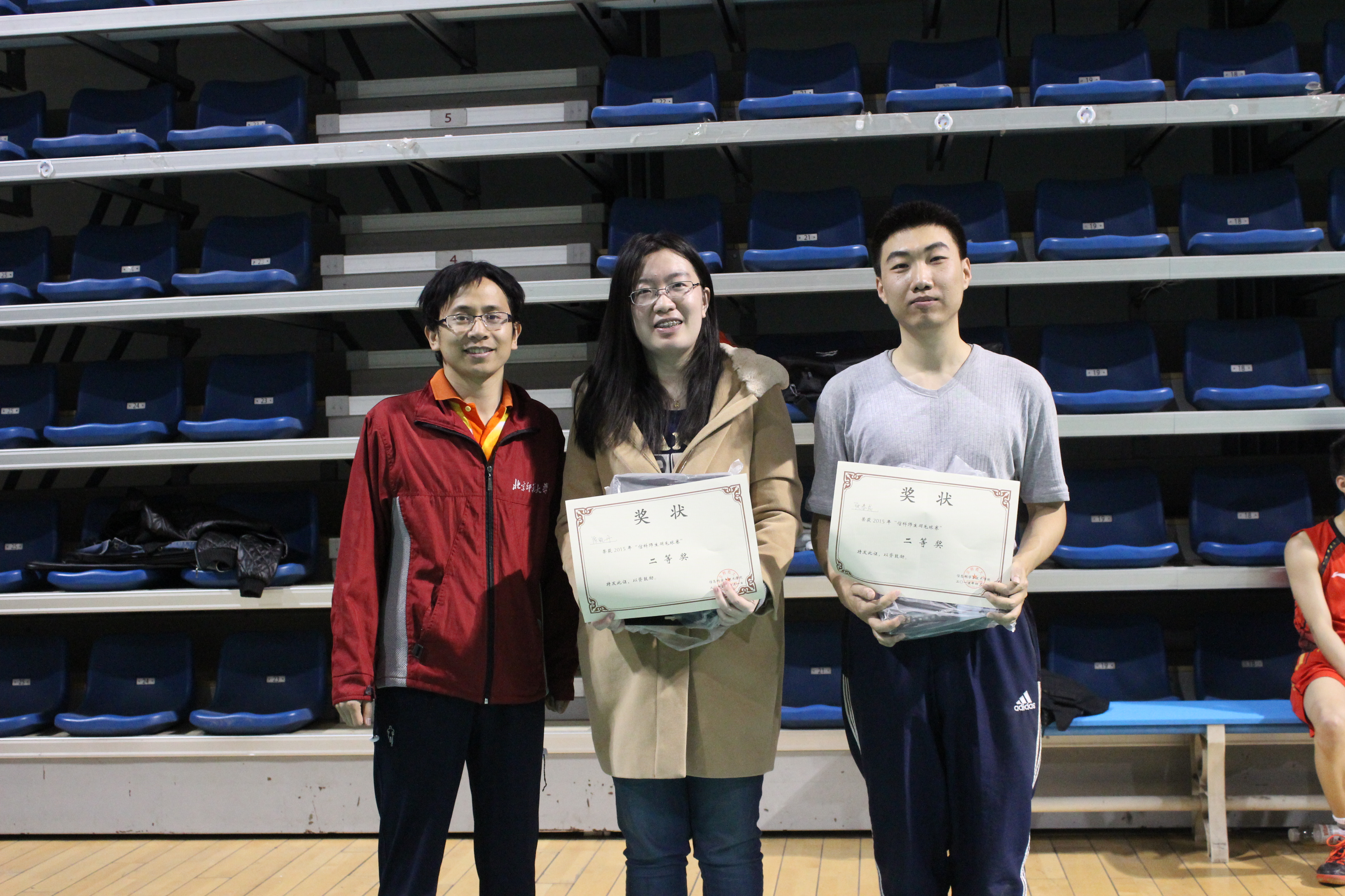 本次羽毛球赛由beat365官网研究生会承办,采用男女混双比赛制,共有30多支队伍报名参赛,选手涵盖了学院各个年级。首先,参赛选手随机分为四组进行小组赛;两轮淘汰赛后,八强队伍进行1/4决赛,获胜队进行半决赛,最后进行冠军争夺赛。经过激烈的角逐,王胜灵、叶成鹏队获得冠军,张春成、陈晓丹队获得亚军,三、四名分别为于思禹、黄小芳队和李嘉良、赵润美队。比赛结束后现场进行颁奖并合影留念,参赛选手们仍意犹未尽,纷纷相约来年再战。比赛进行时,现场观众热情观战,为比赛选手加油助威。