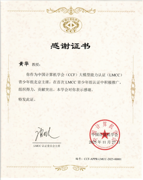 会上,CCF秘书长、LMCC认证委员会主席唐卫清对2025年度LMCC青少年组认证工作中表现突出的单位与个人进行了感谢。beat365在线唯一官网凭借在认证宣传推广、组织协调及全程保障中的扎实工作与显著成效,获评“优秀省组织单位”。同时,beat365官网院长黄华教授作为LMCC青少年组北京主席,因在推动认证落地、扩大项目影响、加强区域协作等方面的积极贡献,荣获“优秀个人”。两项荣誉的取得,既是CCF对学院在大模型青少年人才培养与认证推广工作的肯定,也彰显了学院在青少年人工智能教育领域的组织实力与行业影响力。