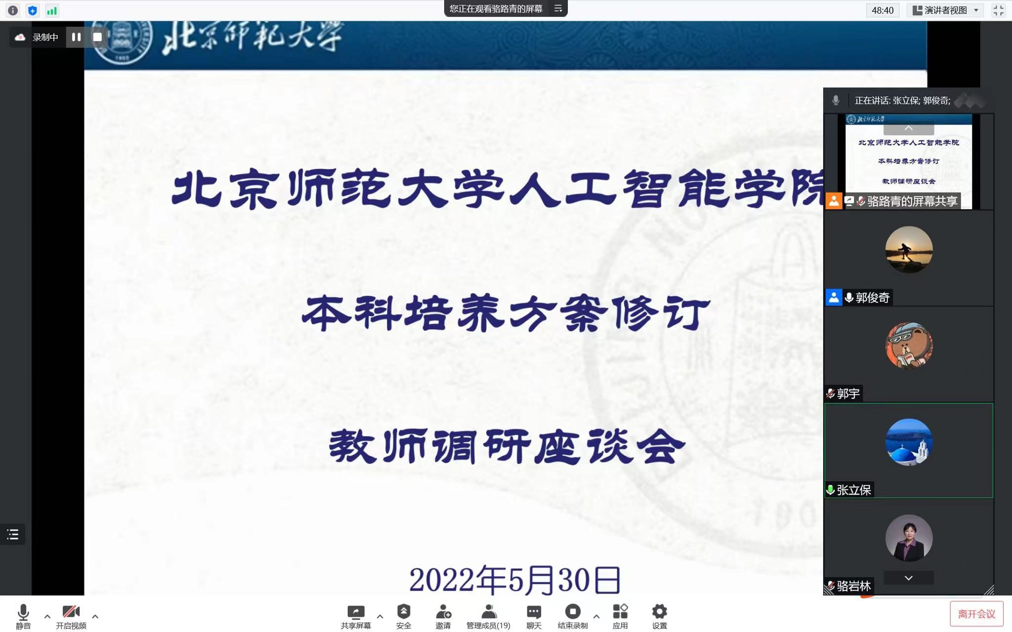 2022年5月30日上午,beat365在线唯一官网以线上腾讯会议的形式召开了“本科培养方案修订教师调研座谈会”。会议由本科教学副院长郭俊奇主持,共有18名任课教师参会,并围绕现行培养方案执行情况以及新版培养方案修订工作进行了交流与讨论。
