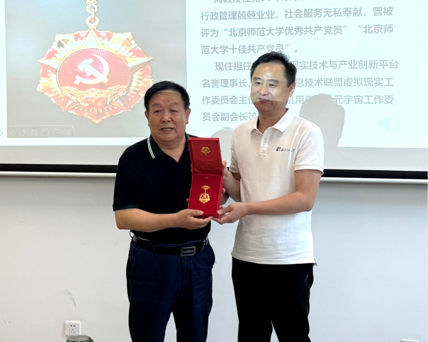 上午9时30分,大会正式开始。首先,黄华院长代表学院为周明全教授颁发“光荣在党50年”纪念章。该荣誉不仅是对老党员的崇高致敬,更传递了不忘初心、接续奋斗的精神力量。周明全教授结合个人经历回顾学院发展历程,并赠亲笔书法“无限风光在险峰”,勉励全院师生勇担时代使命,不断攀登新的高峰。