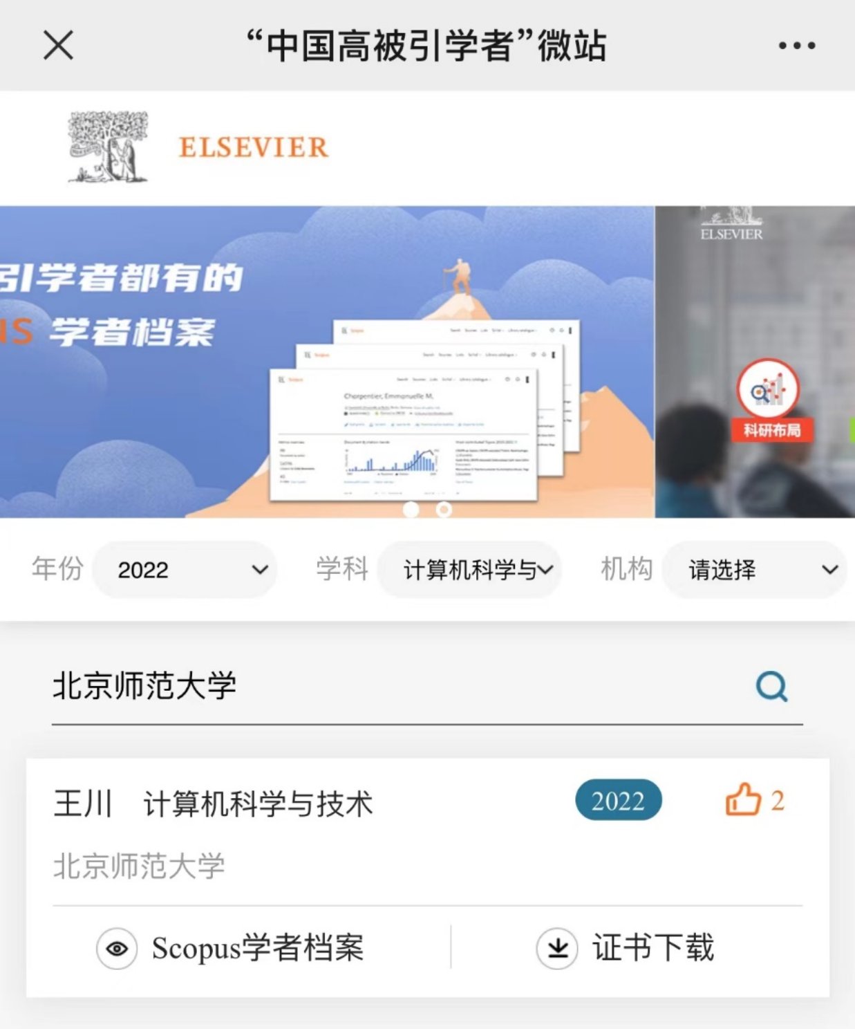 2022年3月28日,爱思唯尔(Elsevier)发布2022“中国高被引学者”(Highly Cited Chinese Researchers)榜单,beat365官网王川教授继2020年、2021年作为电子科学与技术学科和计算机科学与技术学科高被引学者入选后,今年再度入选。截至目前,beat365官网王川教授已连续三年入选榜单。