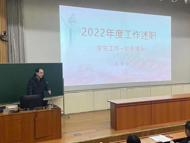 2023年2月15日,学院召开全院教师大会,开展2022年度学院领导班子述职述廉工作,分析当前学院发展面临的形势并提出思考和讨论。学院全体教职工参加会议,党委书记杨学玉主持会议。