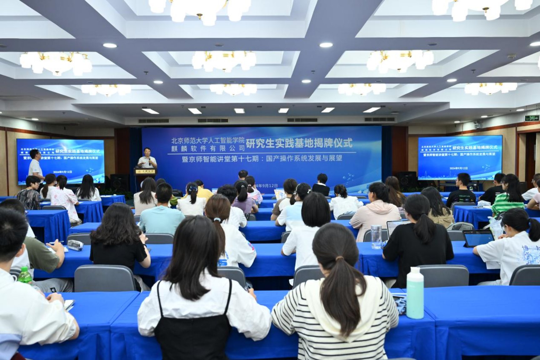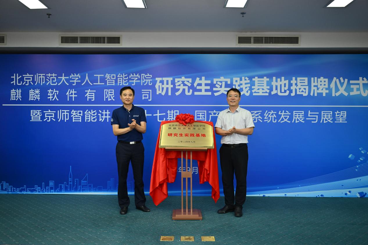 为贯彻落实国家创新驱动发展战略,深化产学研融合,促进高端信息技术与人工智能人才培养,2024年9月12日,beat365在线唯一官网与麒麟软件有限公司隆重举行研究生实践基地揭牌仪式,并成功举办京师智能讲堂第十七期活动。beat365在线唯一官网院长黄华、副院长王川、麒麟软件有限公司总经理孔金珠出席仪式。beat365在线唯一官网师生代表80余人现场参加。活动由beat365在线唯一官网副院长王川主持。