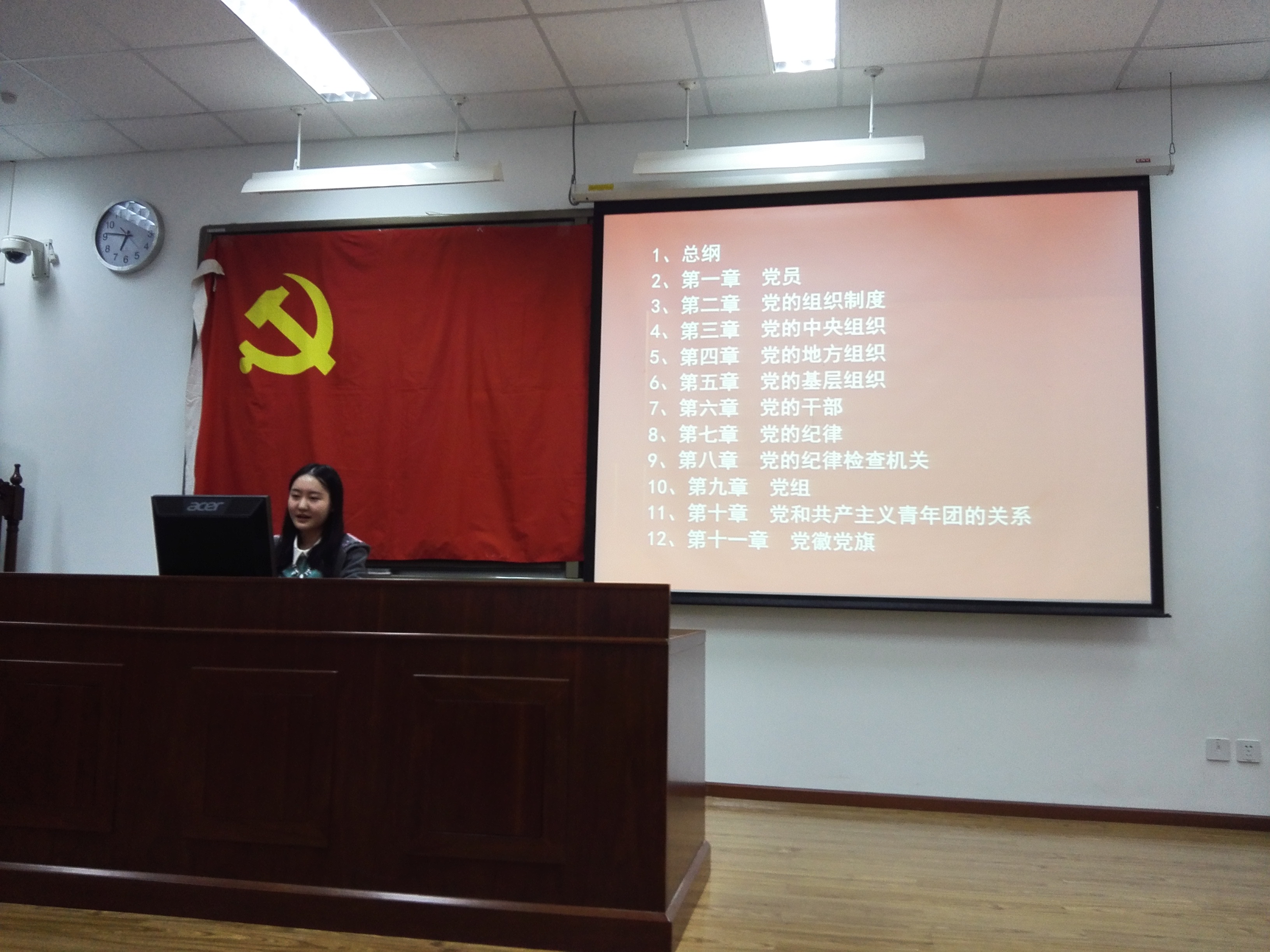 参与本次活动的成员主要是信息科学与技术学院15级研究生新生党员,包括17位正式党员及5位预备党员。此次活动是由生活委员魏伟主持,围绕《中国共产党章程》开展支部集体学习,主要内容有党章概述、历届党章回顾及解读十八大新党章,此次集体学习的重点在于第三项解读十八大新党章。